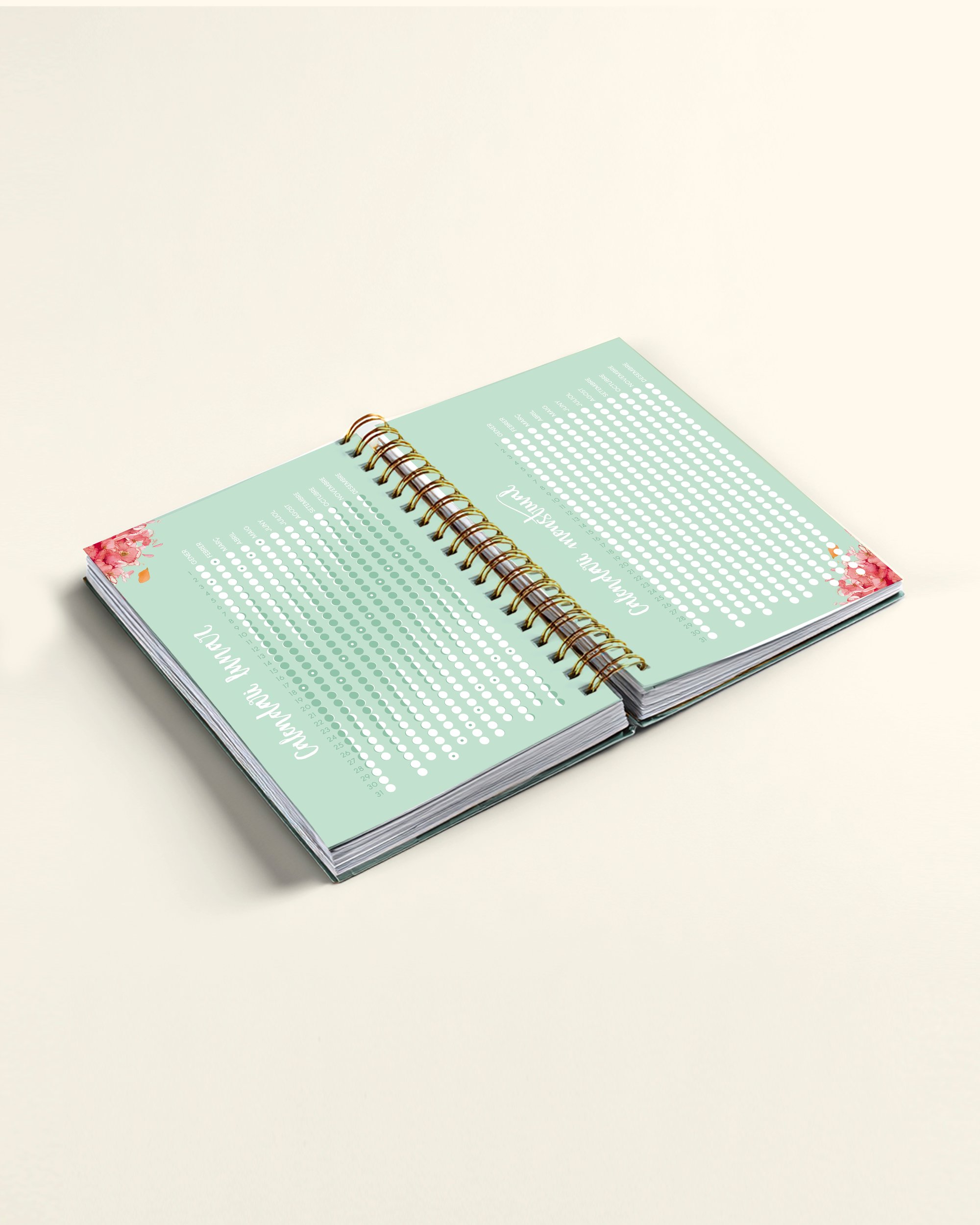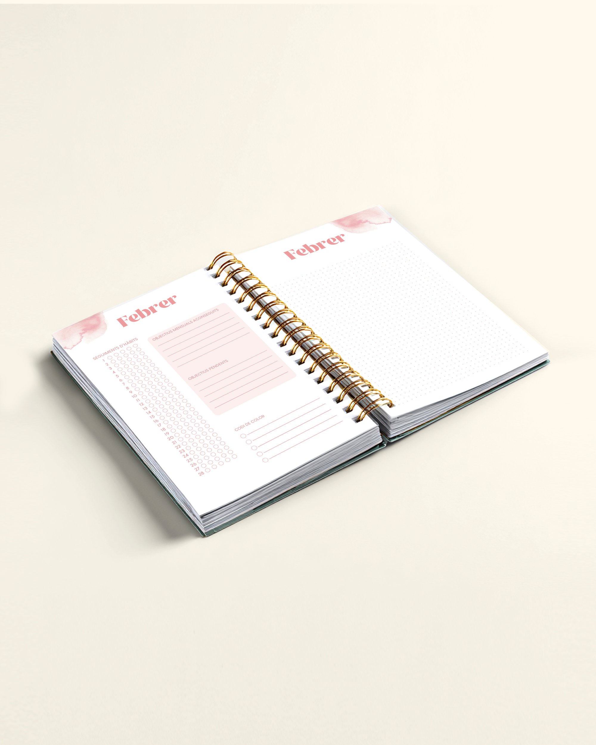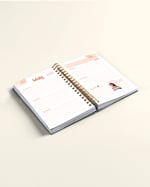 Cada mes té com a portada una deessa de la mitologia grega, un planificador mensual, un full de tracker d'hàbits mensual i una full de notes al final del mes. També té assenyalades les dates importants i les fases lunars.